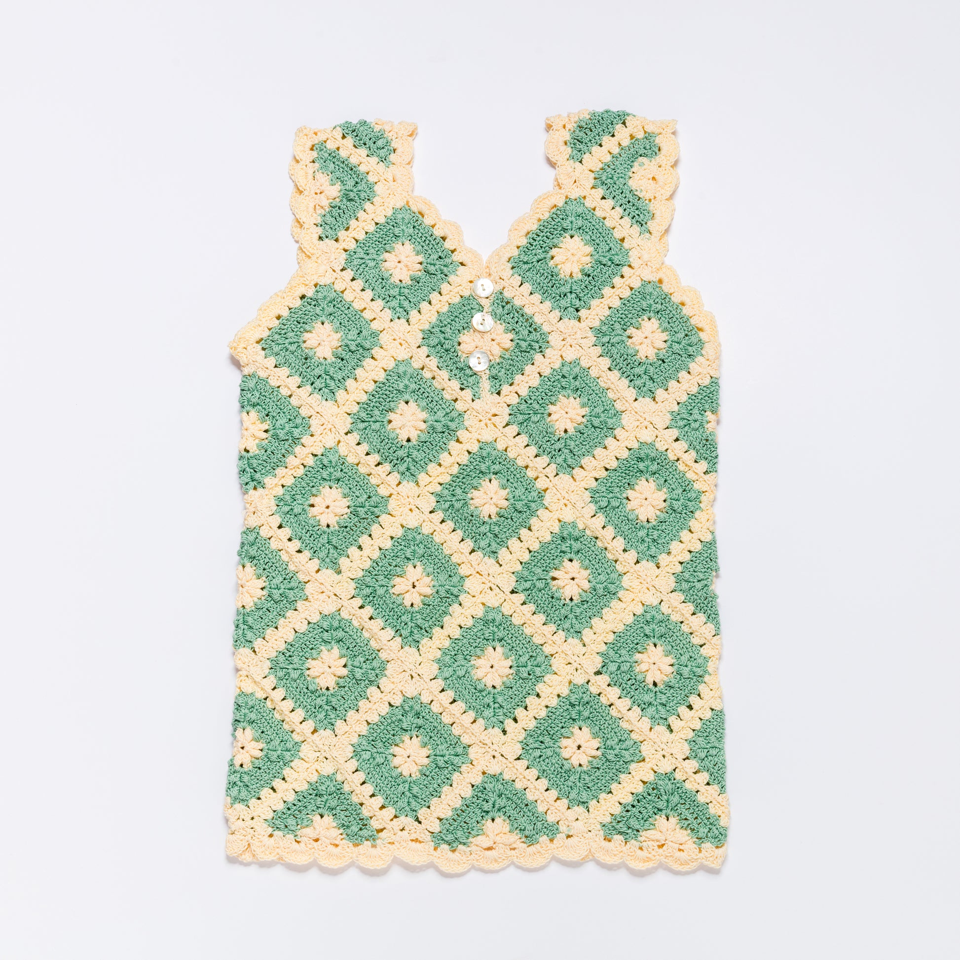 A showpiece of the collection, the ANNA dress is crafted from an intricate composition of crocheted granny squares in vibrant colourways, repeated in varying combinations throughout the design. Finished with three mother of pearl buttons at the back for easy dressing, it offers a modern interpretation of a vintage classic. Designed as a versatile transitional piece, it can be worn on its own or layered with our LEILA Double Collar Blouse.