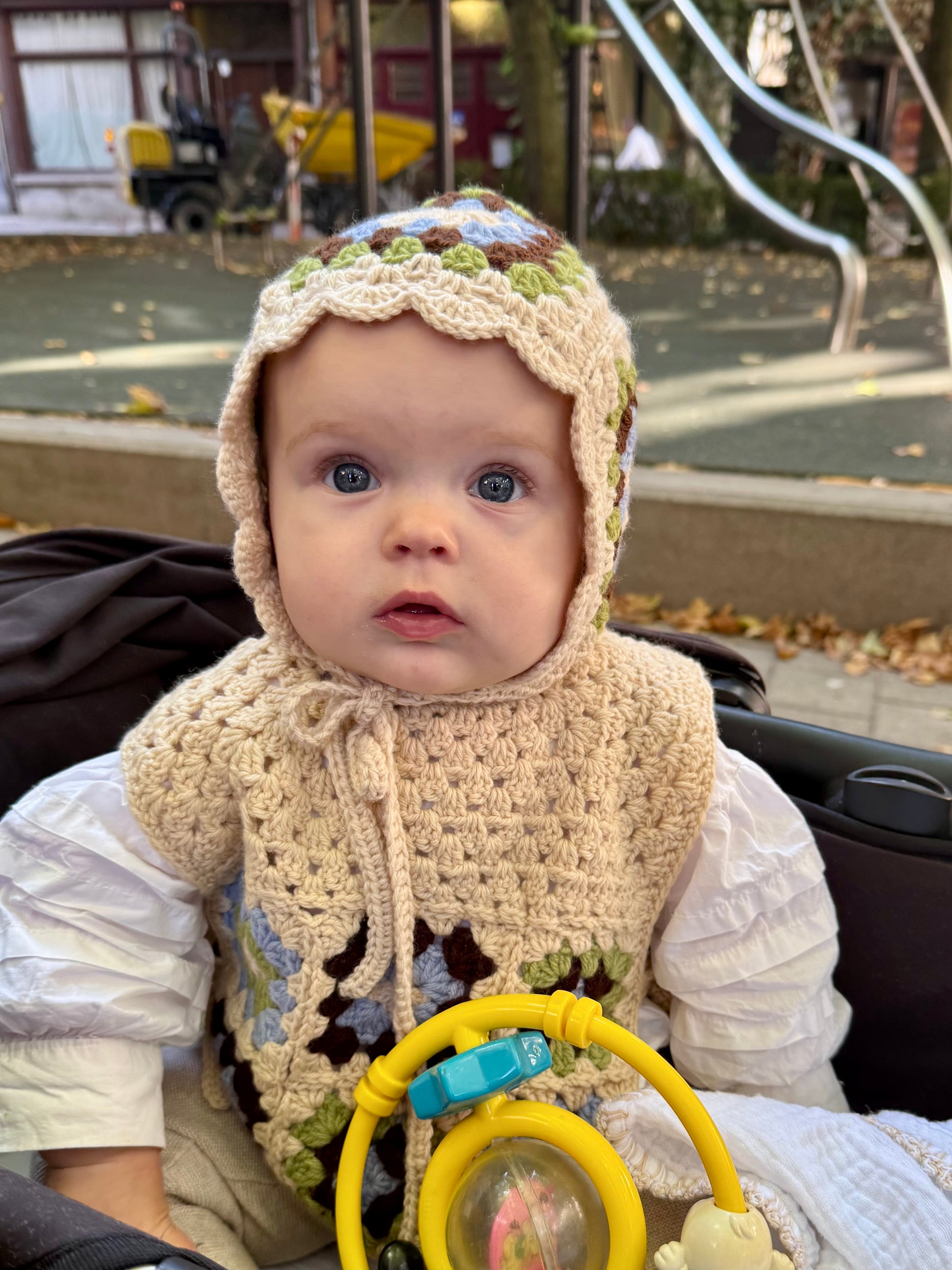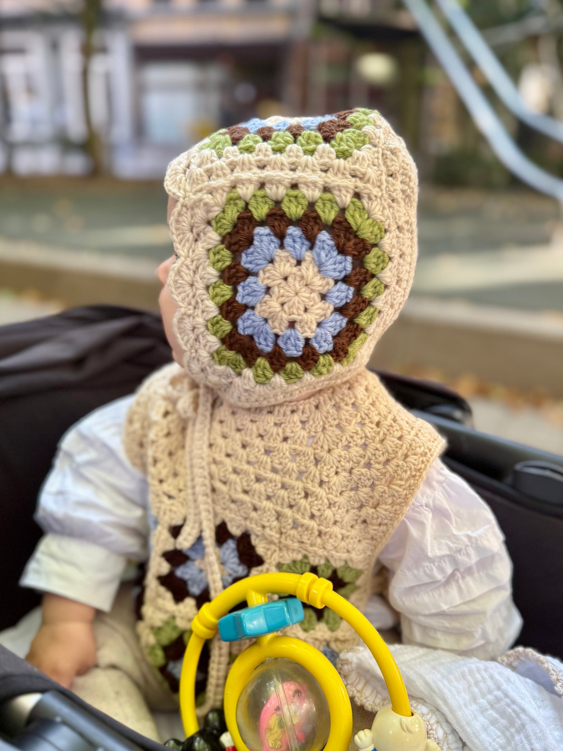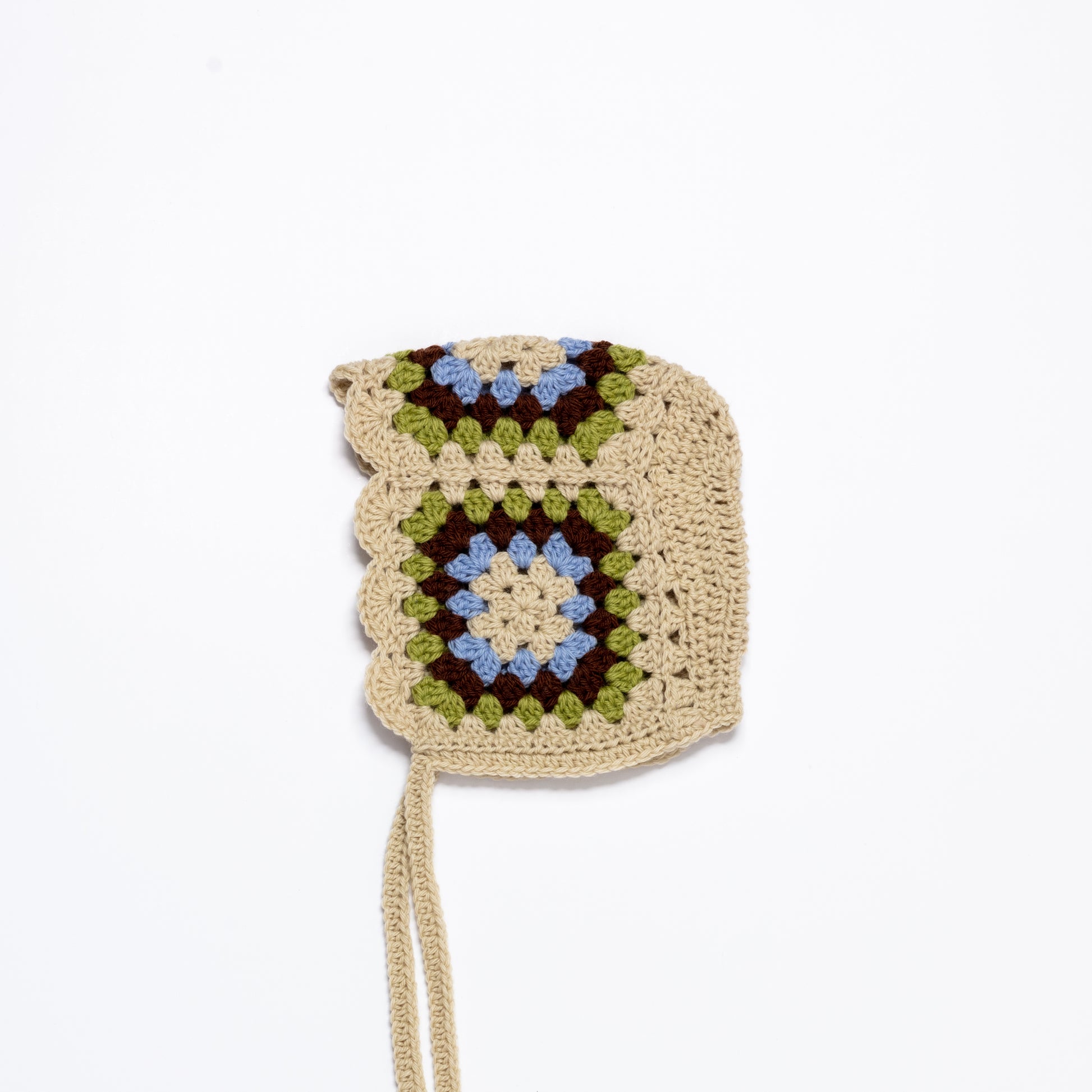 A wool bonnet with a bold granny square motif, the ultimate winter accessories for newborns.