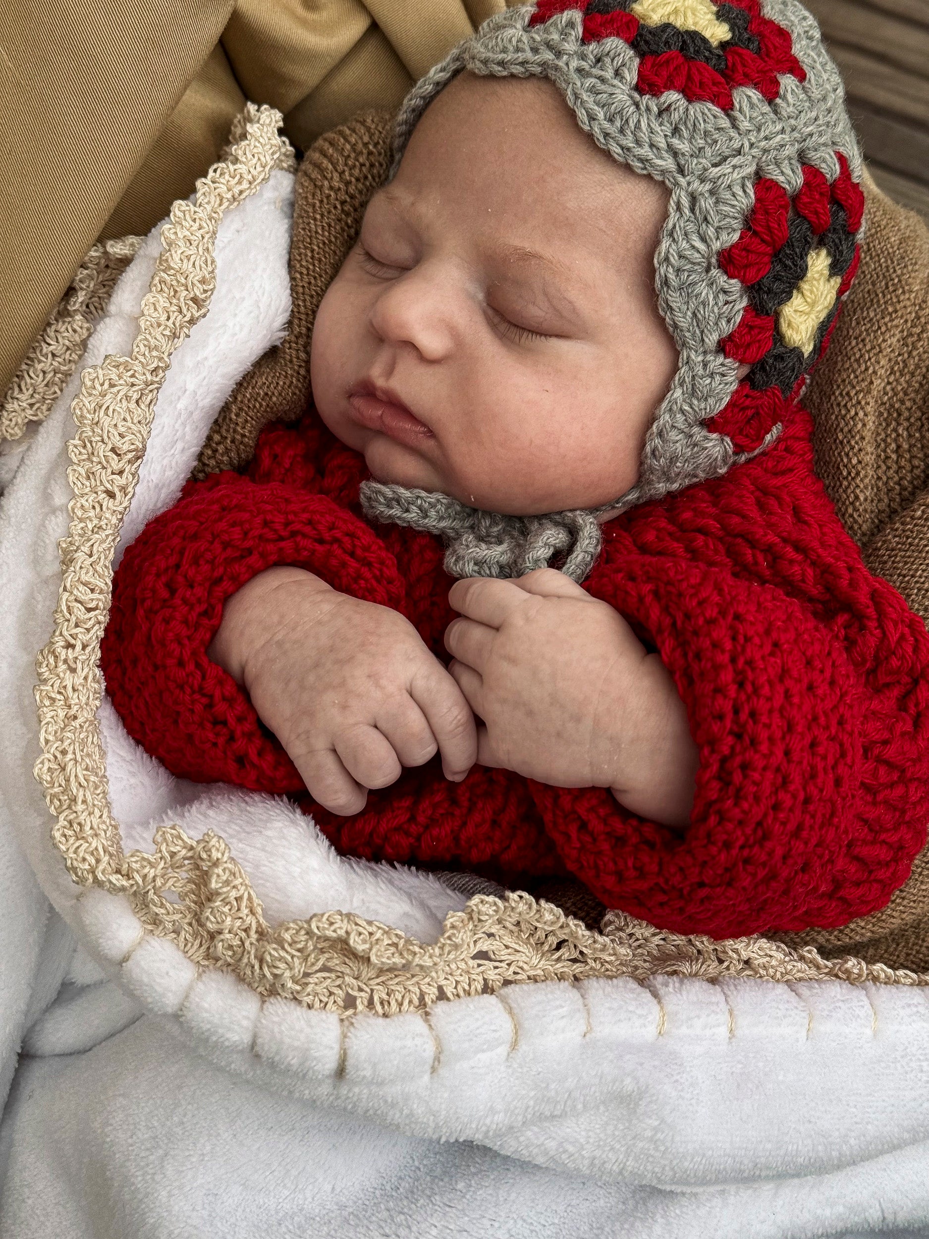 A wool bonnet with a bold granny square motif, the ultimate winter accessories for newborns.