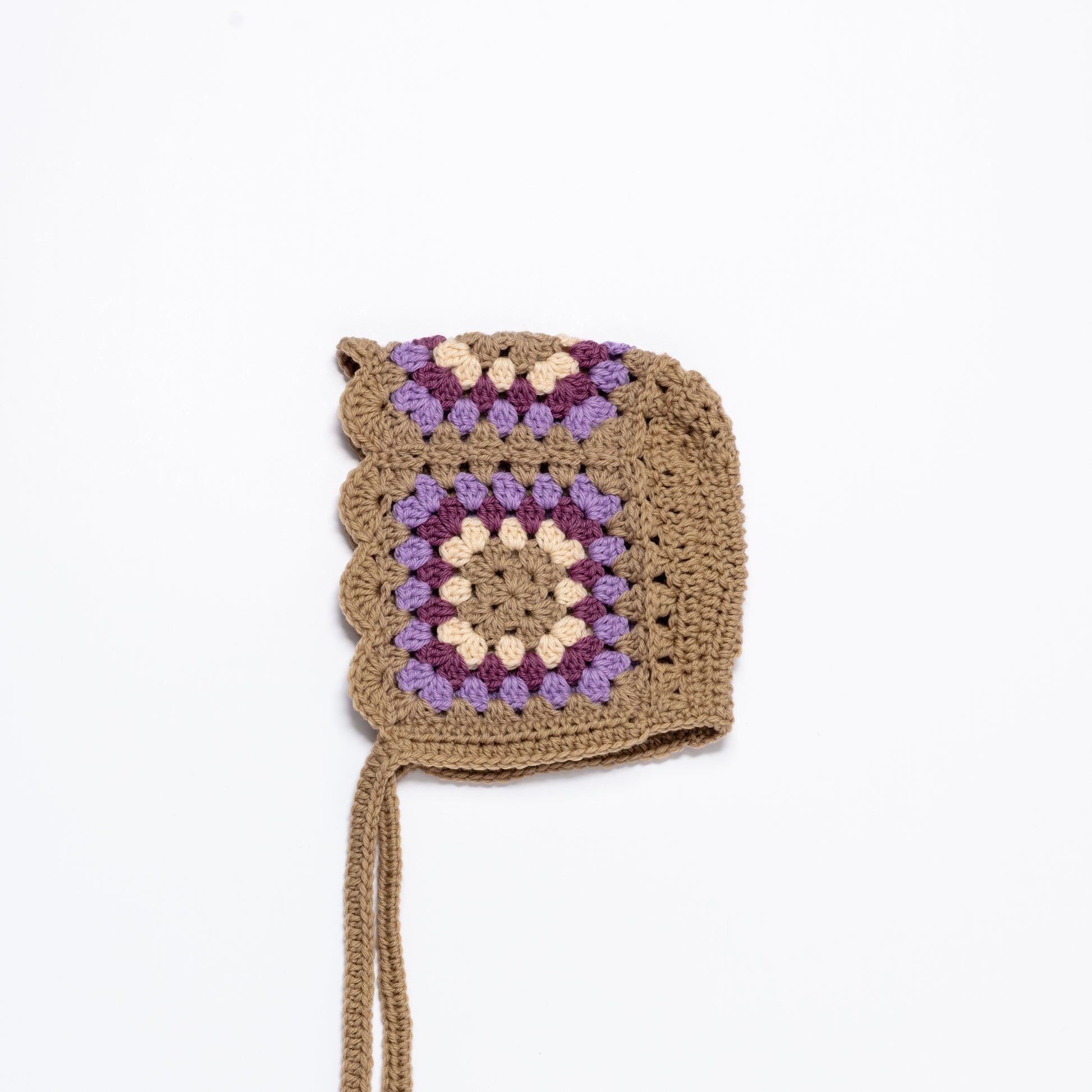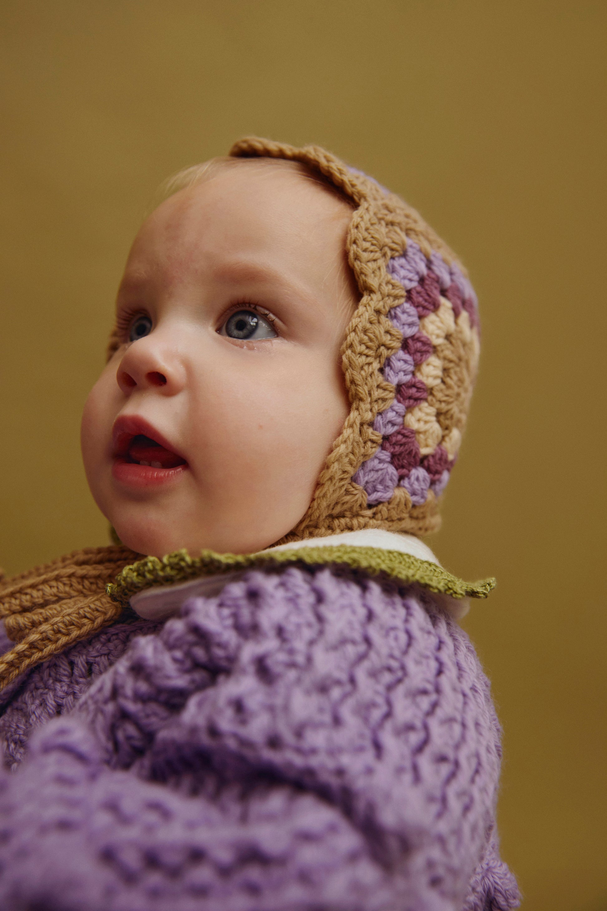 A wool bonnet with a bold granny square motif, the ultimate winter accessories for newborns.