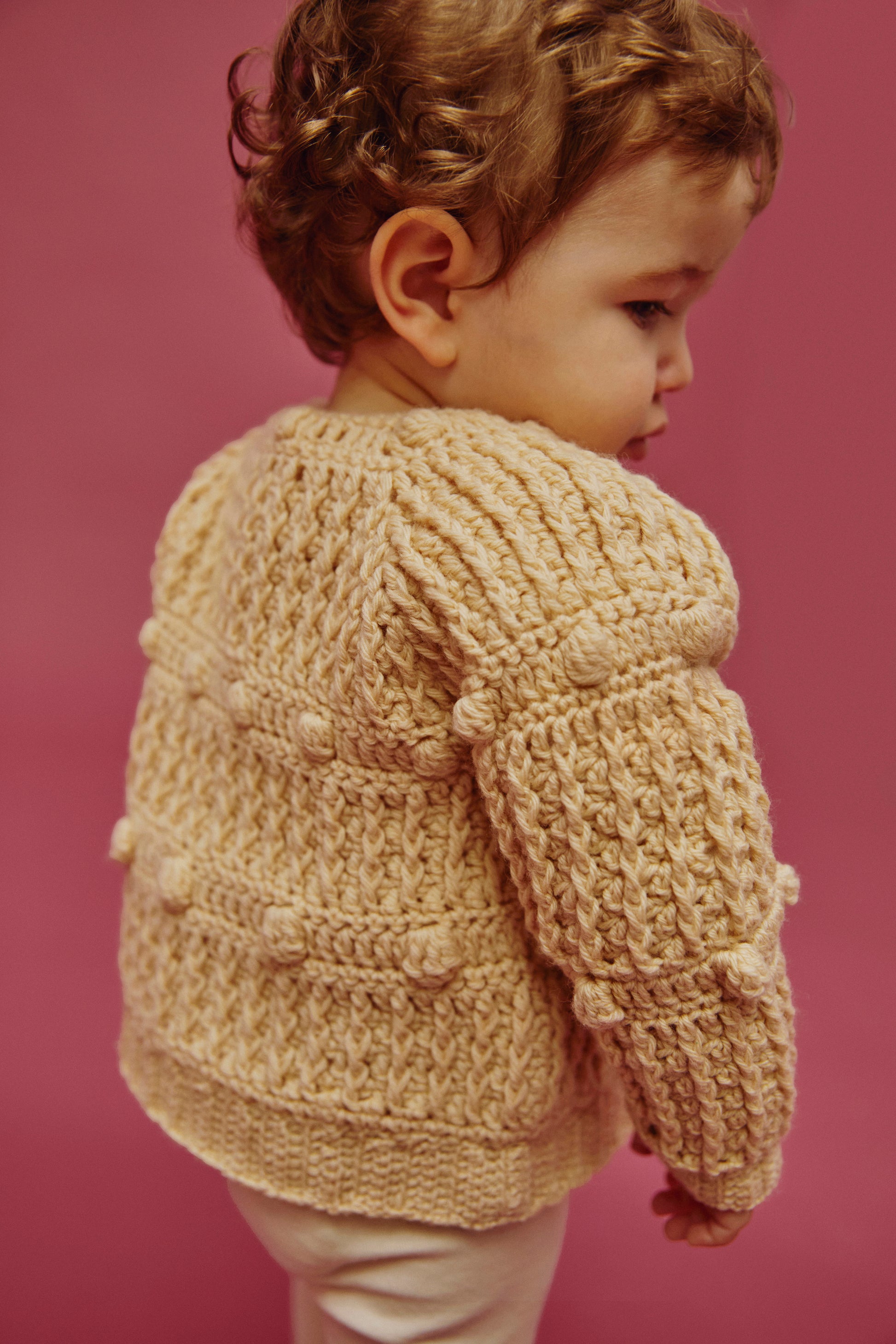 A timeless cardigan in soft wool, finished with popcorn stitch detailing and mother of pearl buttons. It's a style we keep coming back to and an absolute all-rounder in our kids' closets!