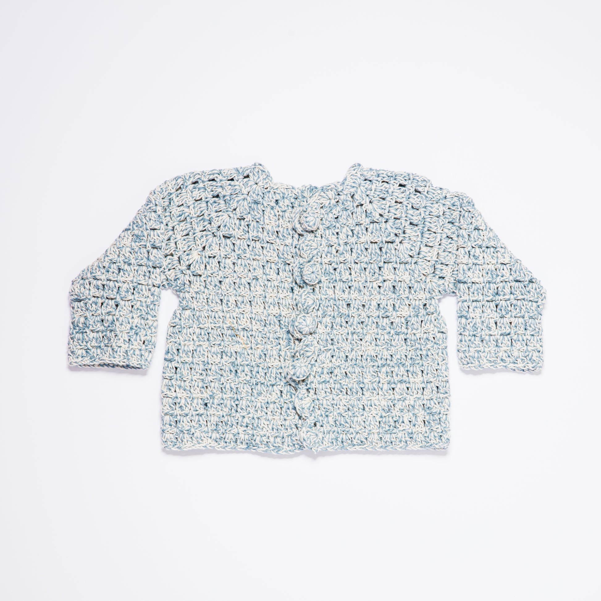A vintage-inspired crochet vest, handmade in two complementary yarns for texture and softness. Fastened with matching crochet buttons.