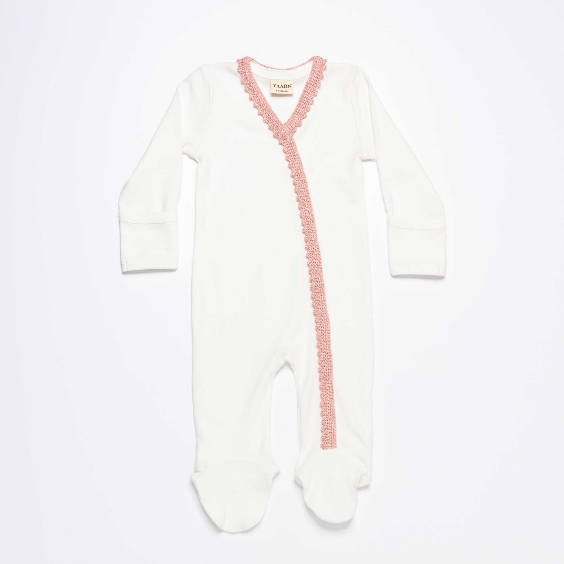 An all-in-one jersey style with crochet detailing around the neckline and leg. Snap buttons run all the way down the front for easy changing and dressing.