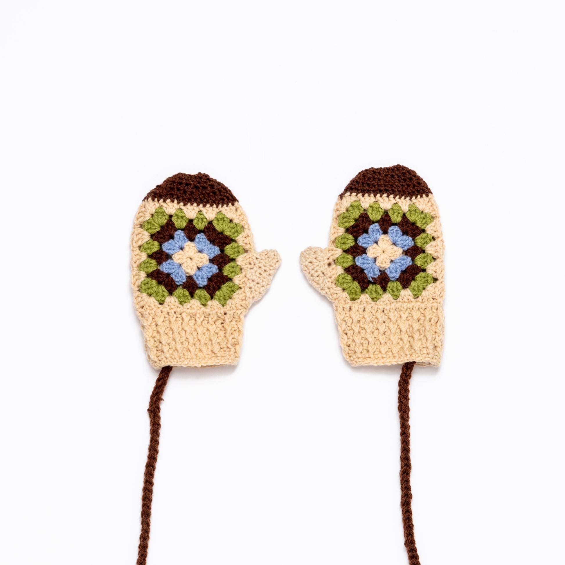 Soft woolen mittens with a detachable string. Finished in our modern granny square pattern, they pair beautifully with the rest of our wool collection.