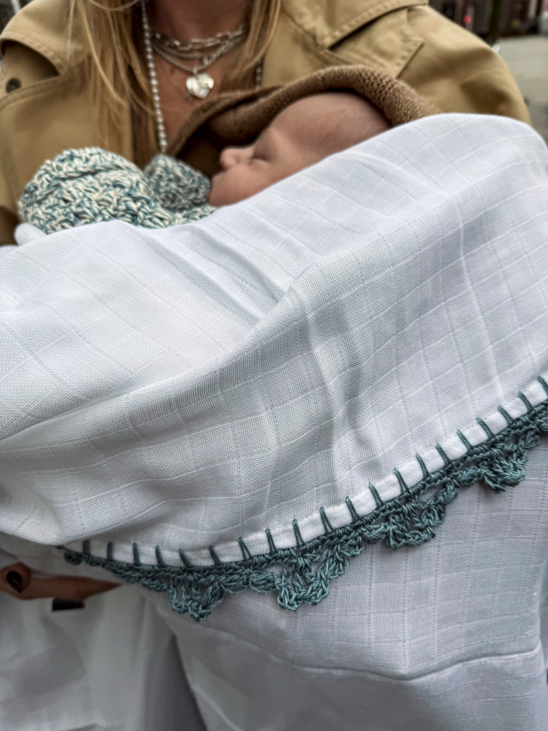 Our muslin swaddles are the ultimate everyday essential for their million and one uses, one can never have too many. They are breathable, made of the softest cotton and this version, with a wider crochet border, adds a touch of extra charm.