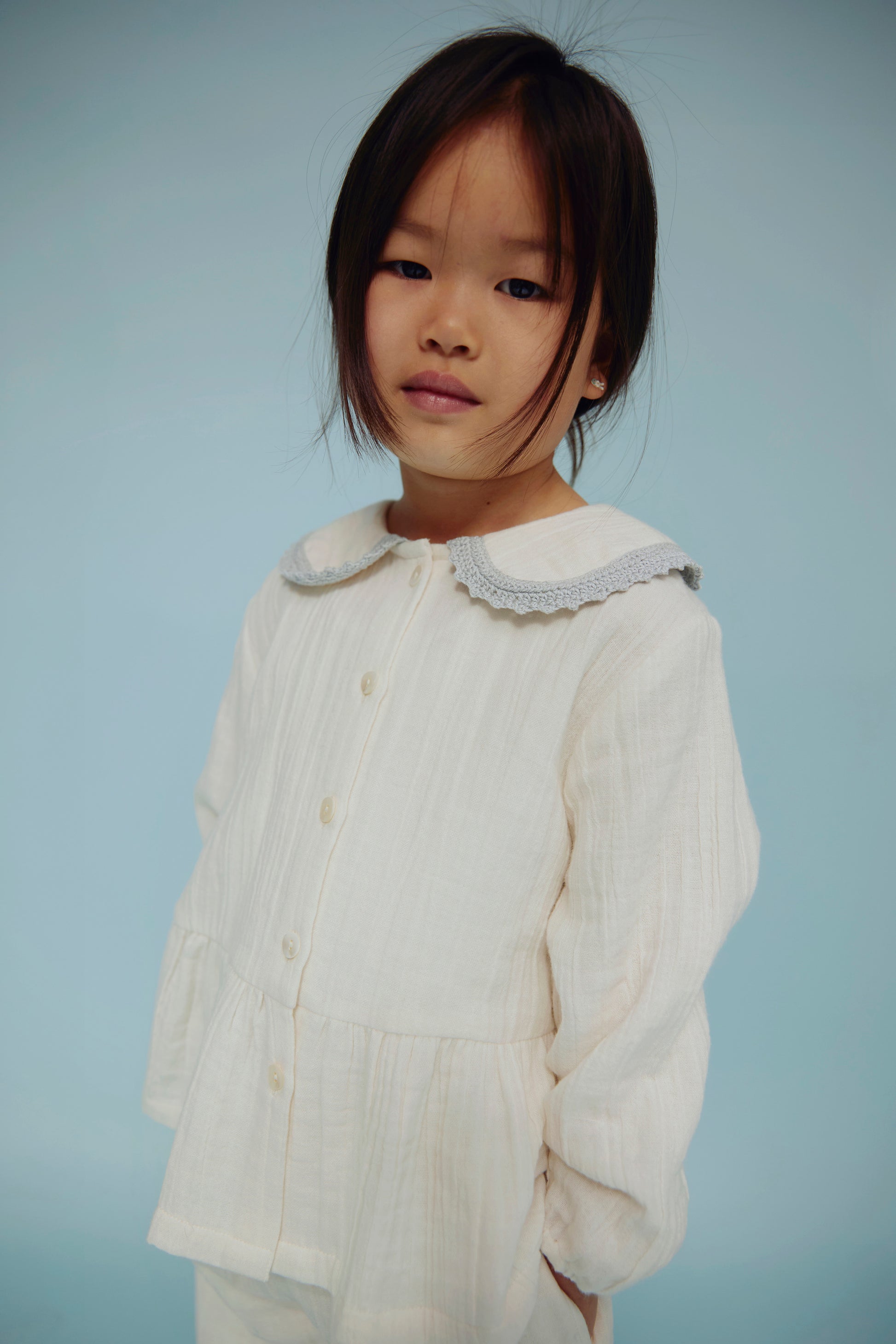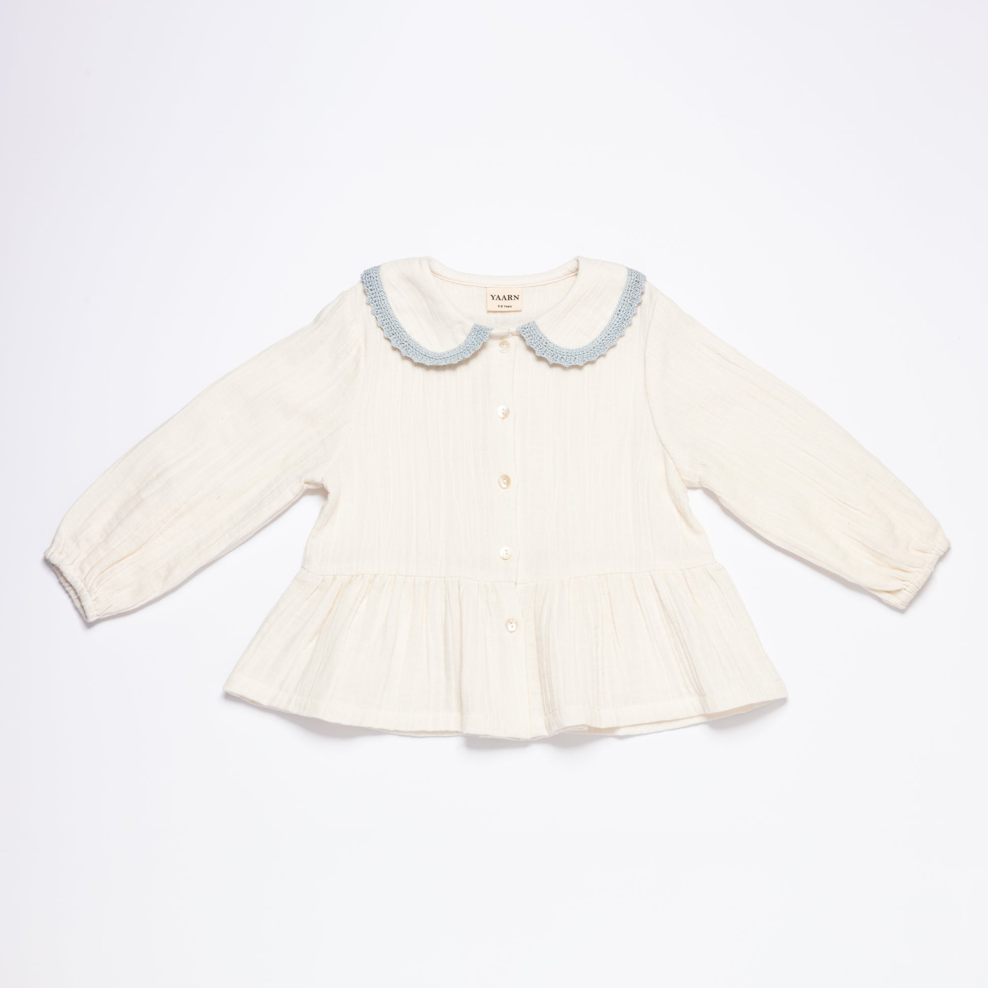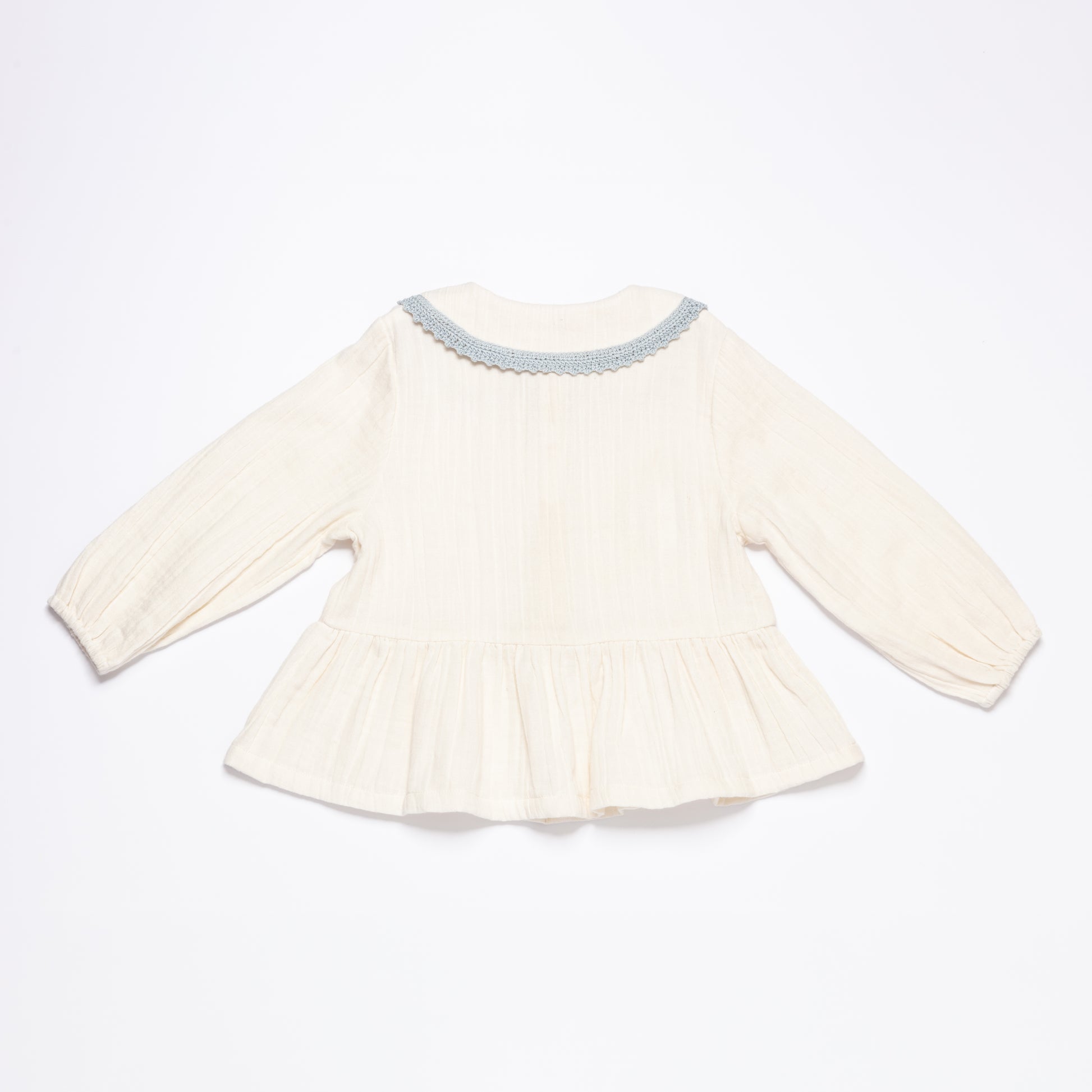 A long-sleeved peplum blouse with a standout fabric collar finished in signature crochet trim. Features mother of pearl buttons and elasticated cuffs.
