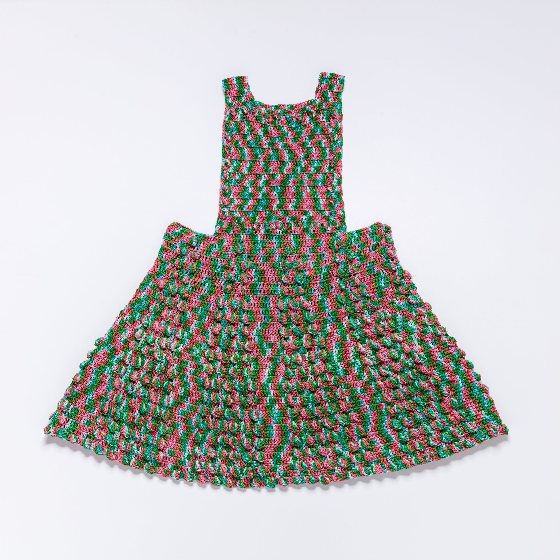 The JUNE pinafore dress is a true celebration of craftsmanship and a beautiful example of what a handmade heirloom piece can be. Designed as a festive statement style, it features a delicately dotted crochet pattern across the bodice, with textured bubble stitches continuing throughout the skirt. Made using custom-developed yarns, each colourway feels unique and playful, highlighting the artistry behind the piece. The dress closes with mother of pearl buttons at the back, features adjustable straps that can be crossed for a personalised fit, and is finished with an elasticated waistband for added comfort.