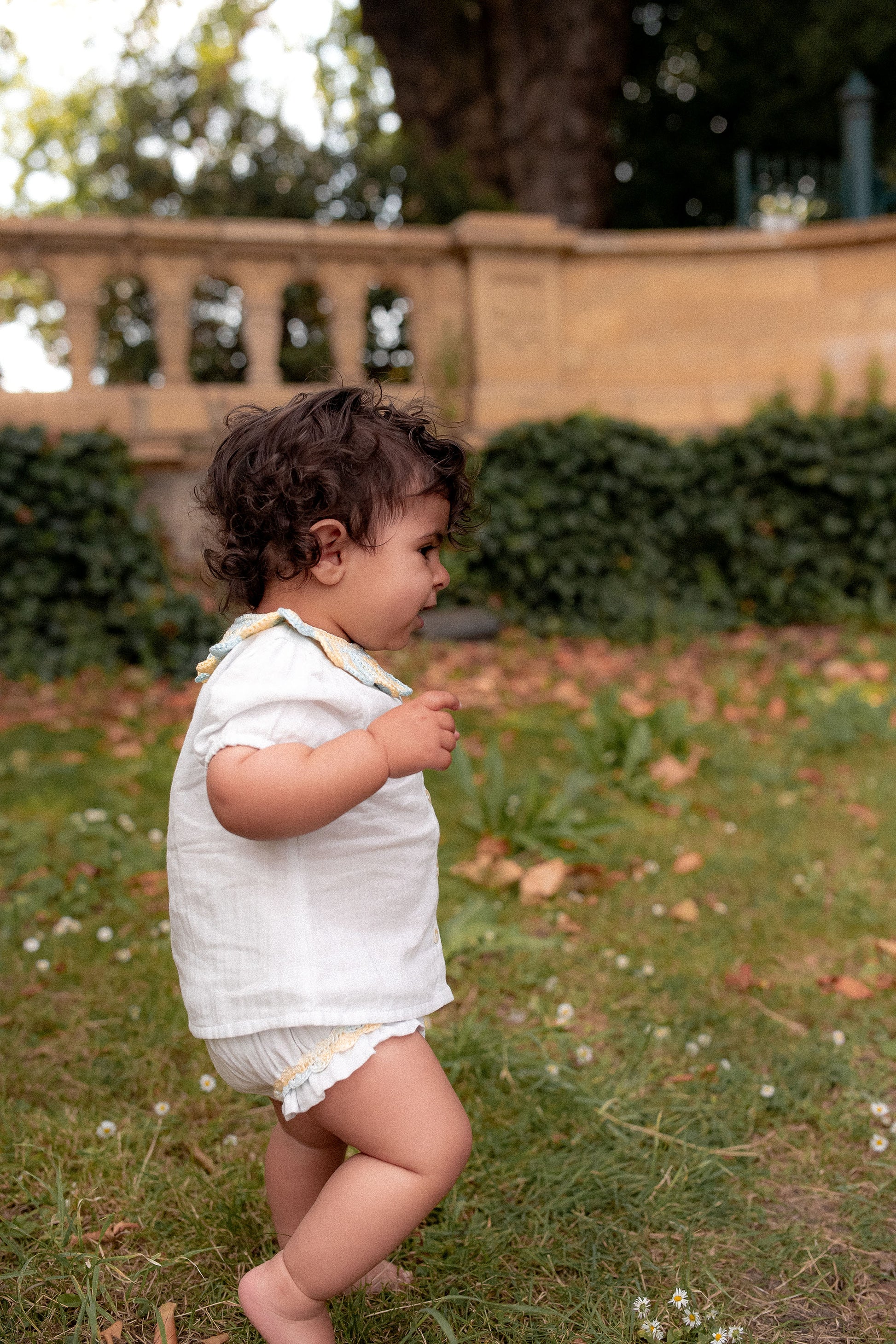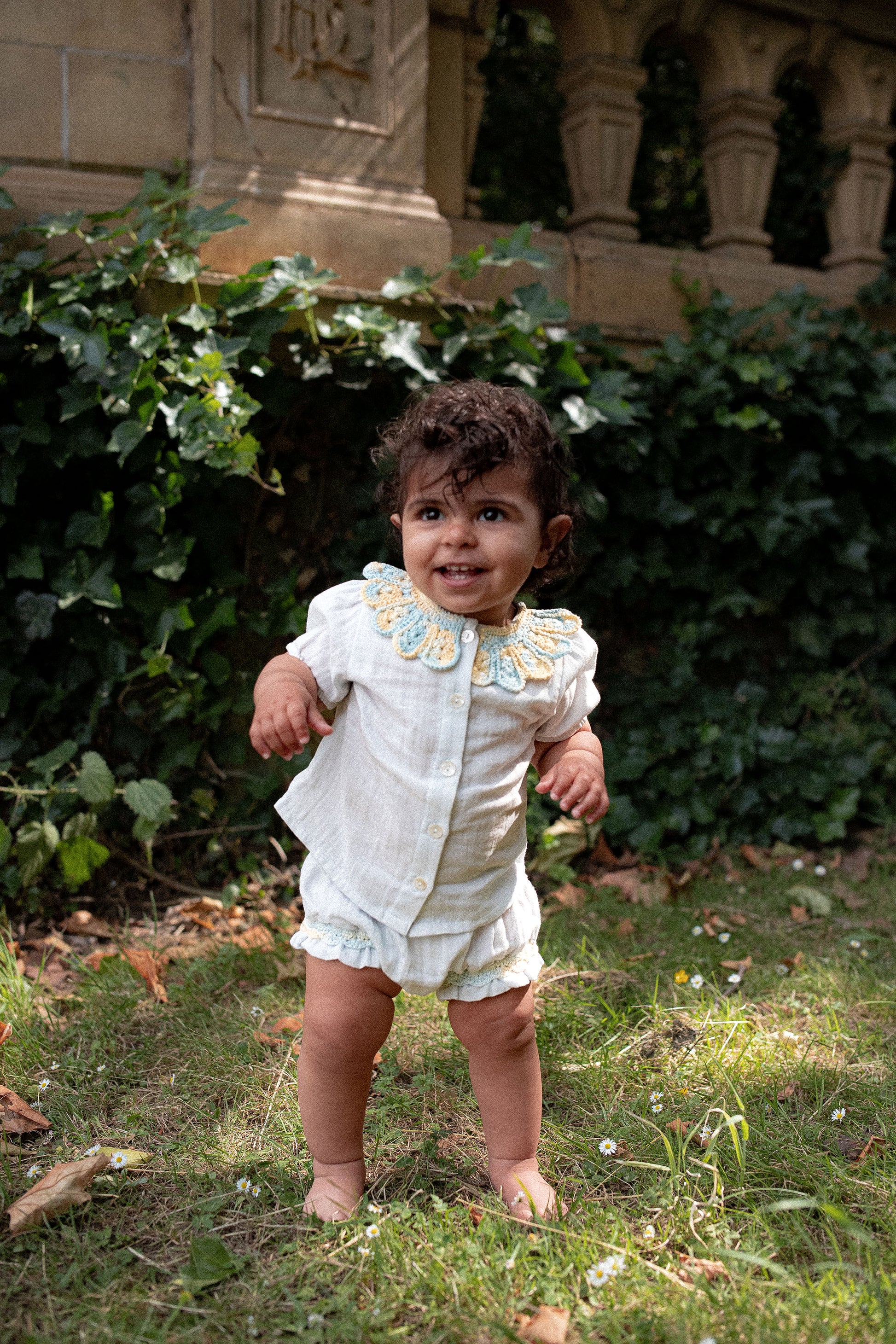 We use 100% organic fabrics and cotton sourced locally in India, while our wool—imported from Australia and New Zealand—is expertly processed, spun, and dyed in the North of India. Our crochet is mindfully produced in our Antwerp atelier, with every pattern thoughtfully designed, combining a variety of stitches and textures to create pieces that are timeless, detailed, and truly heirloom.