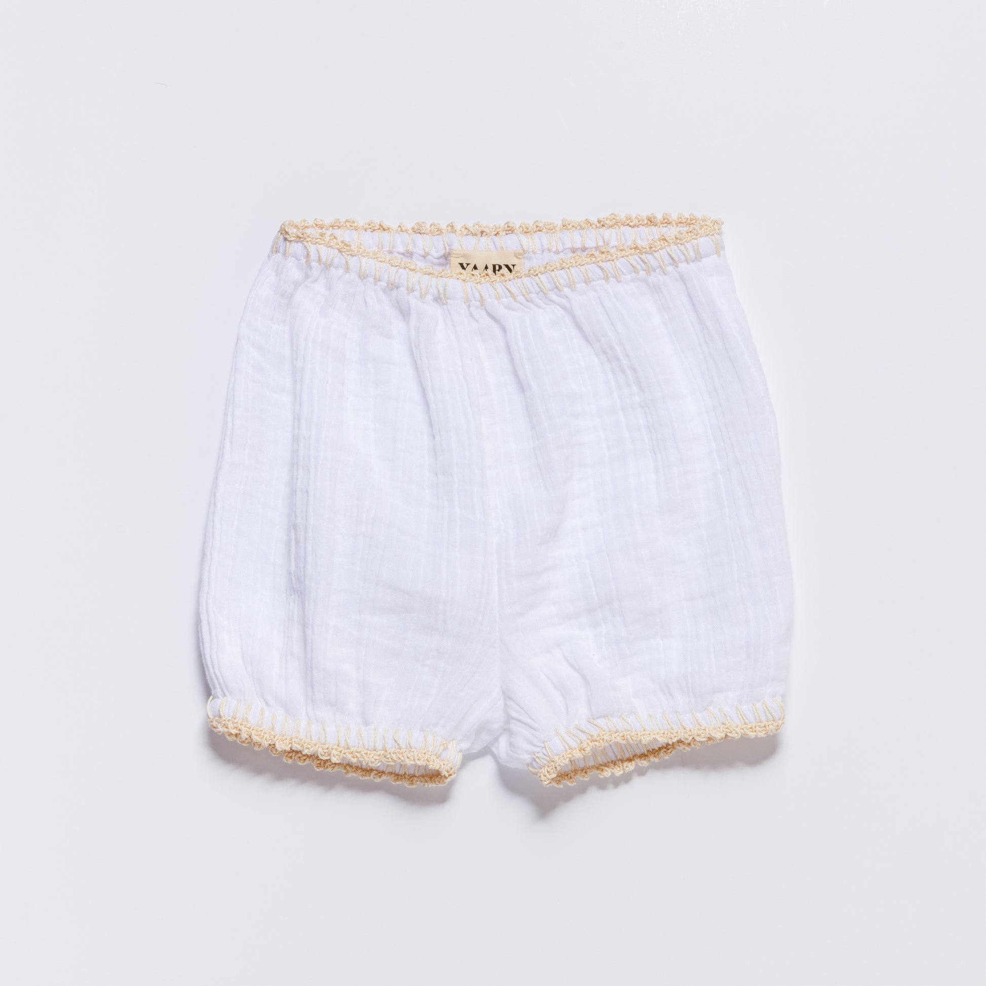 Our PARKER shorts are crafted from soft muslin and designed with a loose bloomer silhouette. Finished with elasticated waist and leg openings, they create a gentle balloon shape that’s both comfortable and playful. Designed to pair beautifully with our FLORA or NINA blouse for a coordinated muslin and crochet look.