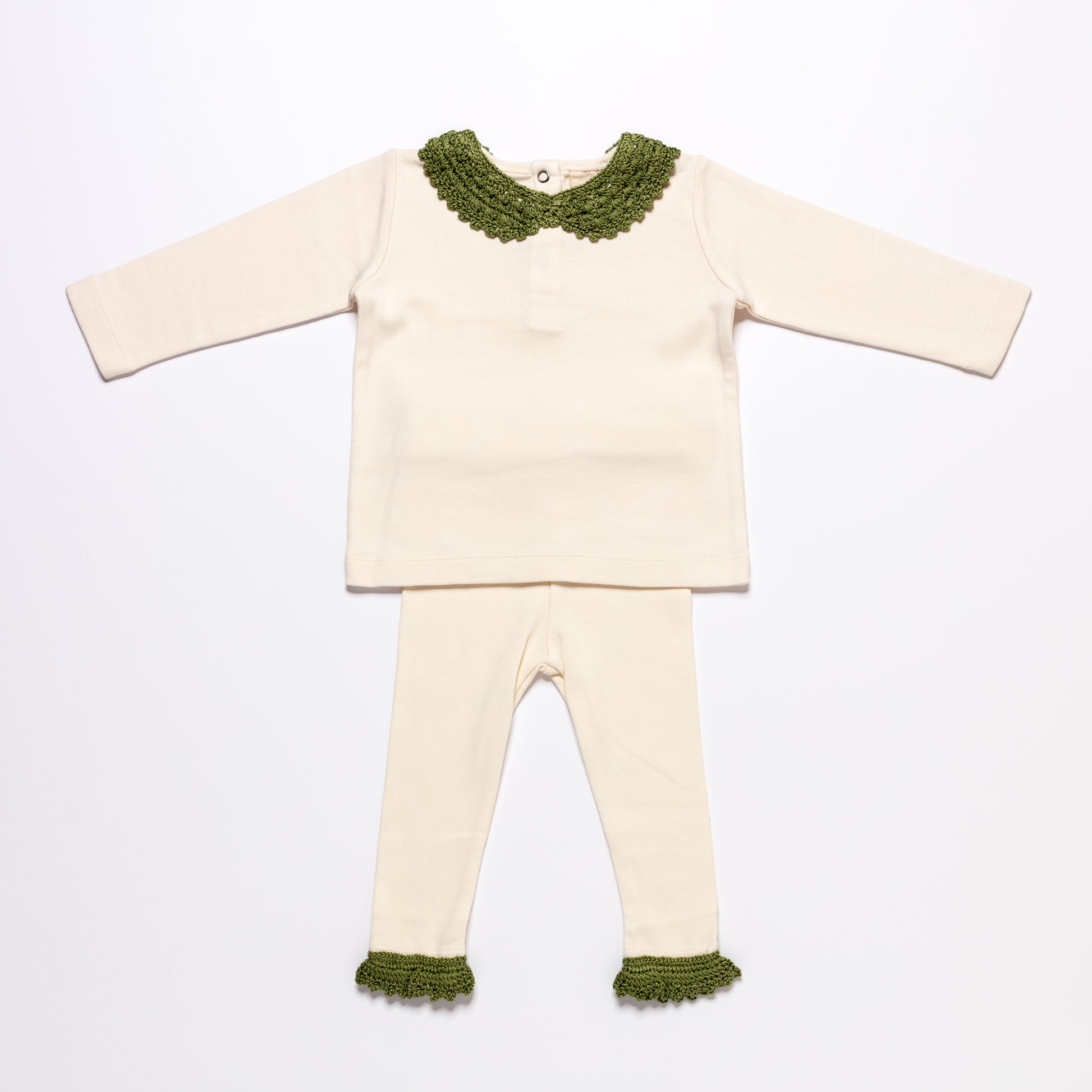 are a comfortable wardrobe staple with delicate crochet details. Made from a soft organic cotton jersey the t-shirt is finished with a classic crochet collar and has 3 snap buttons down the back for easy dressing. The leggings have an elastic waistband and elastic leg openings that are finished with our signature crochet trim.