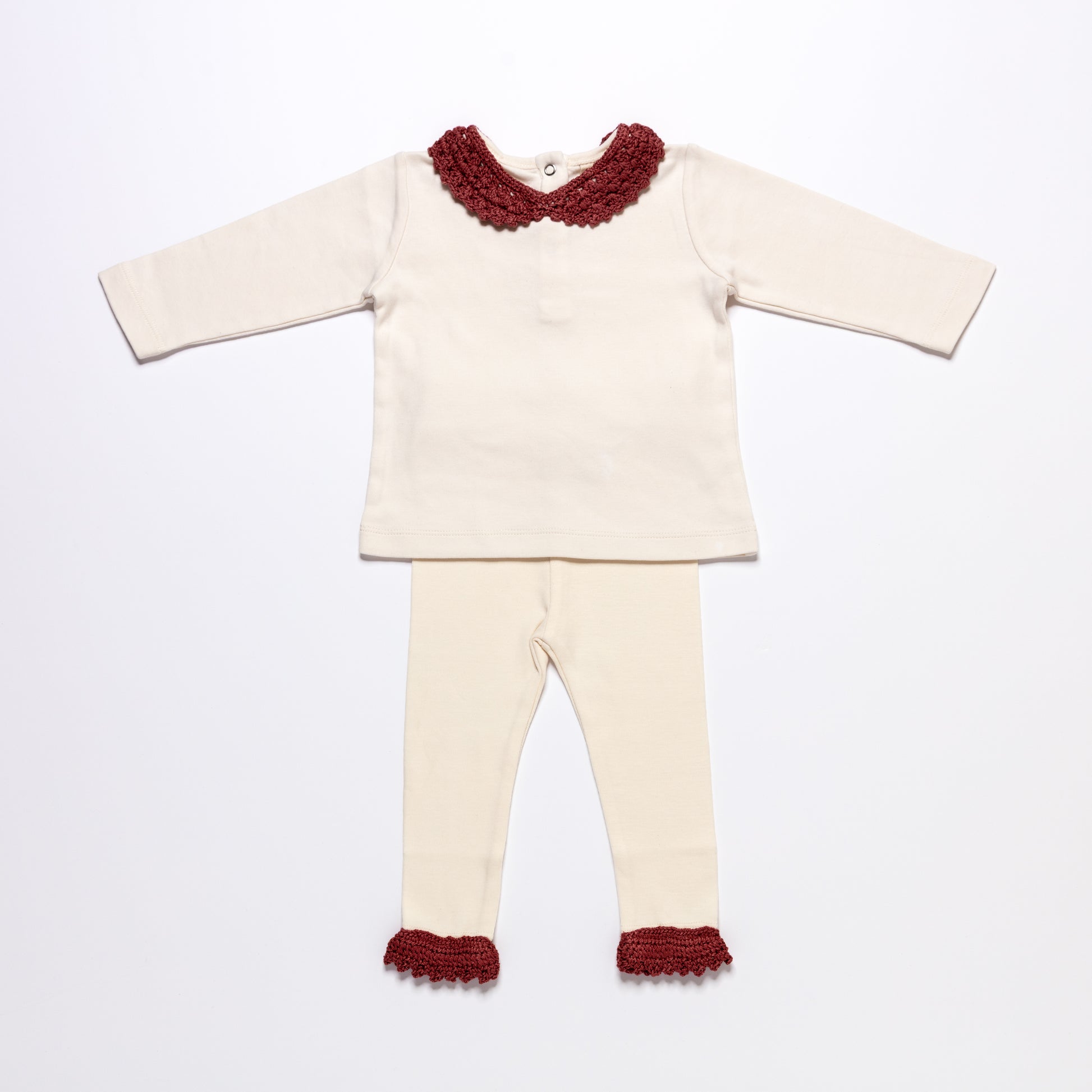 are a comfortable wardrobe staple with delicate crochet details. Made from a soft organic cotton jersey the t-shirt is finished with a classic crochet collar and has 3 snap buttons down the back for easy dressing. The leggings have an elastic waistband and elastic leg openings that are finished with our signature crochet trim.