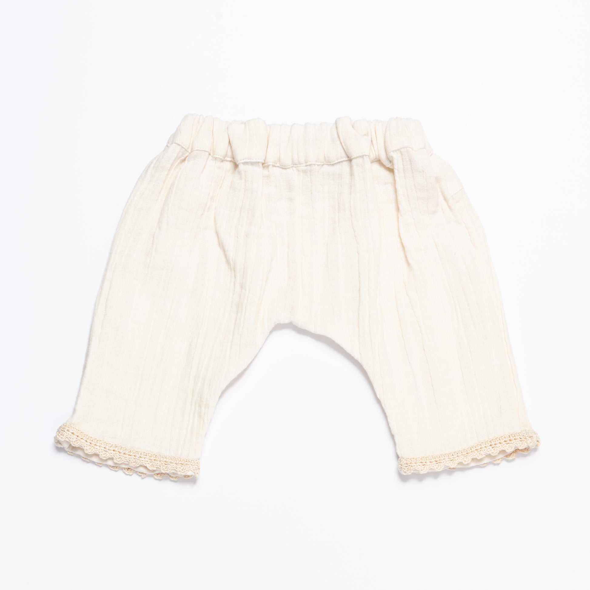 Easy-wear muslin trousers with an elastic waistband and subtle crochet finish at the hems. Designed for comfort and style, they pair beautifully with the NINA blouse.