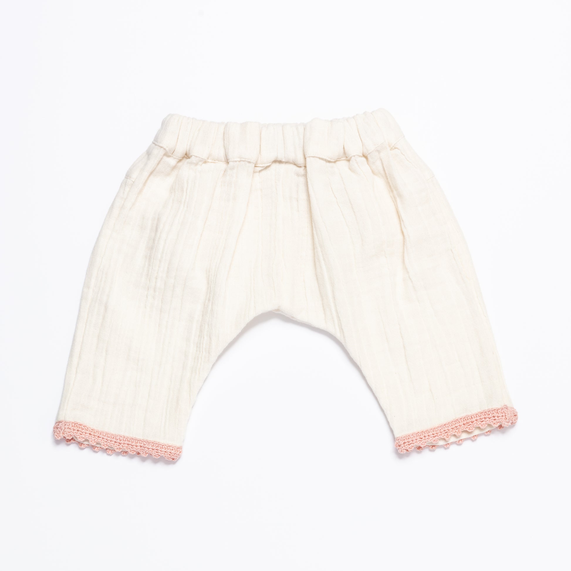 Easy-wear muslin trousers with an elastic waistband and subtle crochet finish at the hems. Designed for comfort and style, they pair beautifully with the NINA blouse.