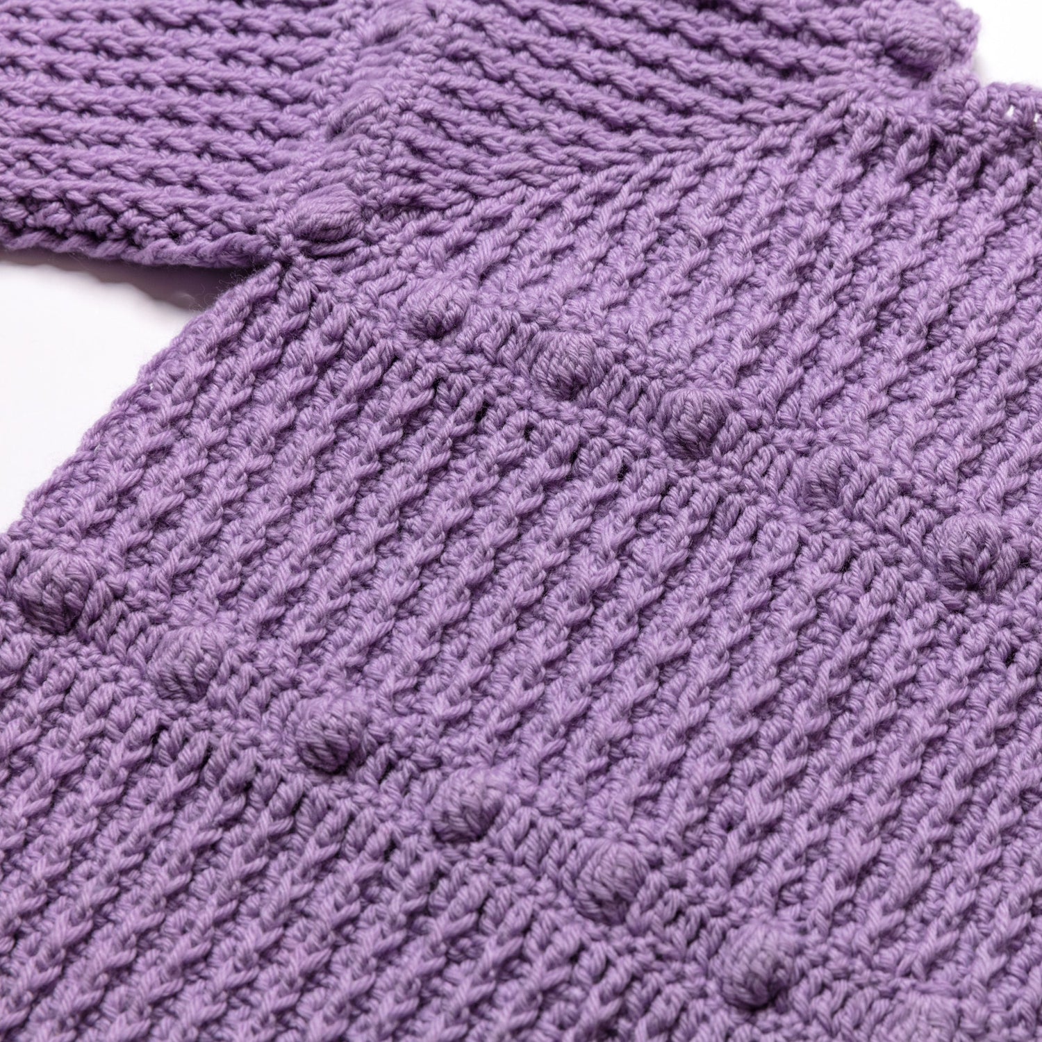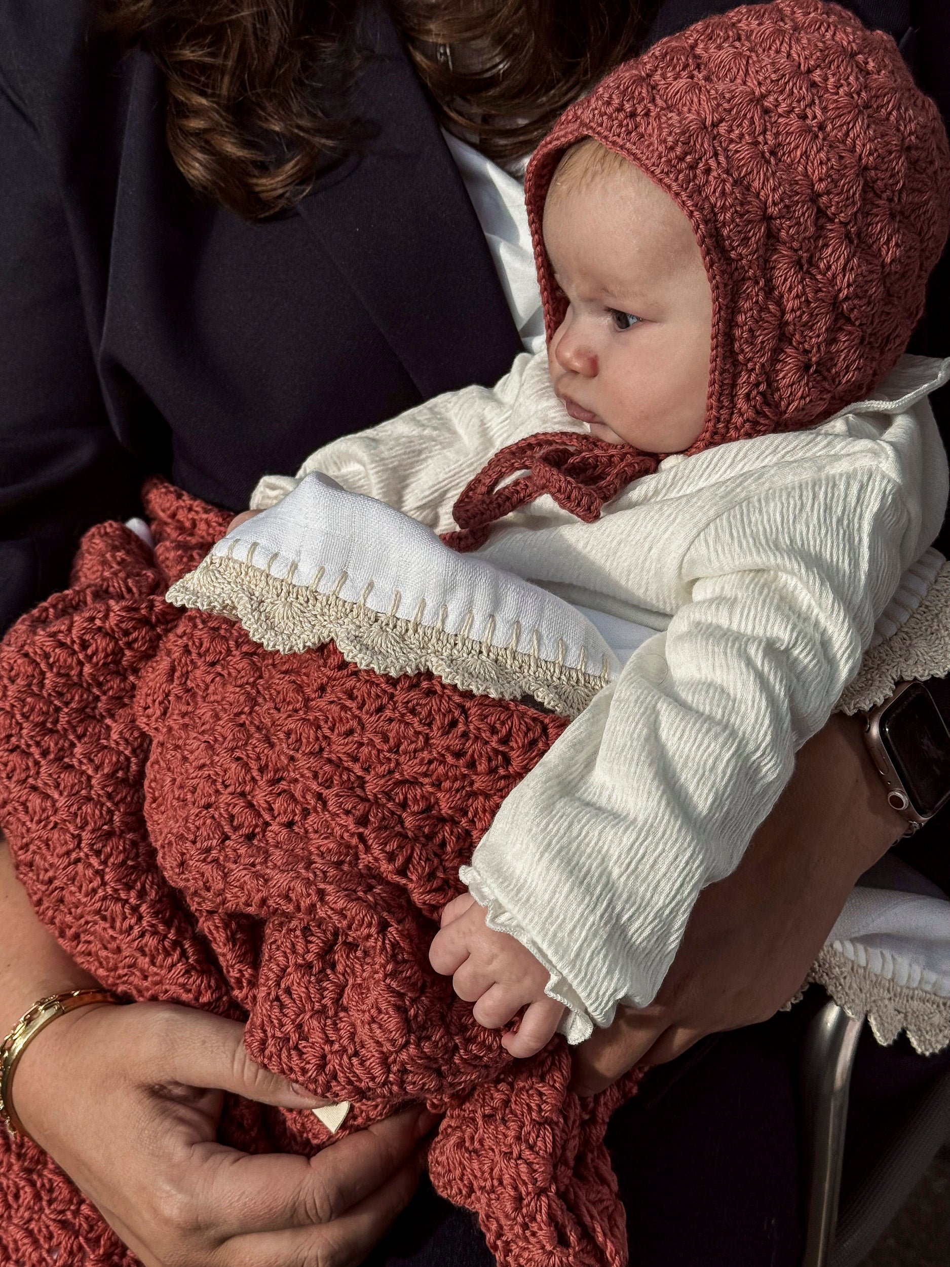 This warm Winter bonnet is lovingly crafted in one of our favourite wool crochet stitches. Designed for a snug and comfortable fit, it keeps little heads cozy during the colder months.