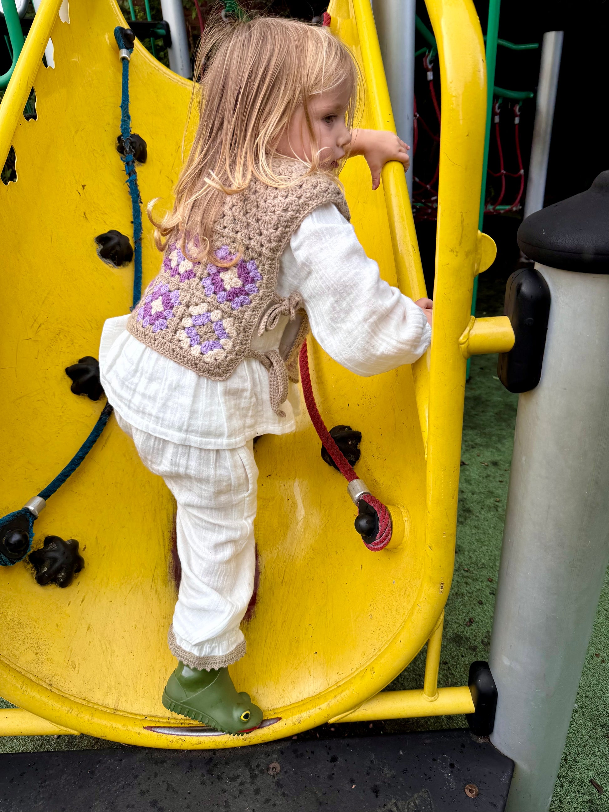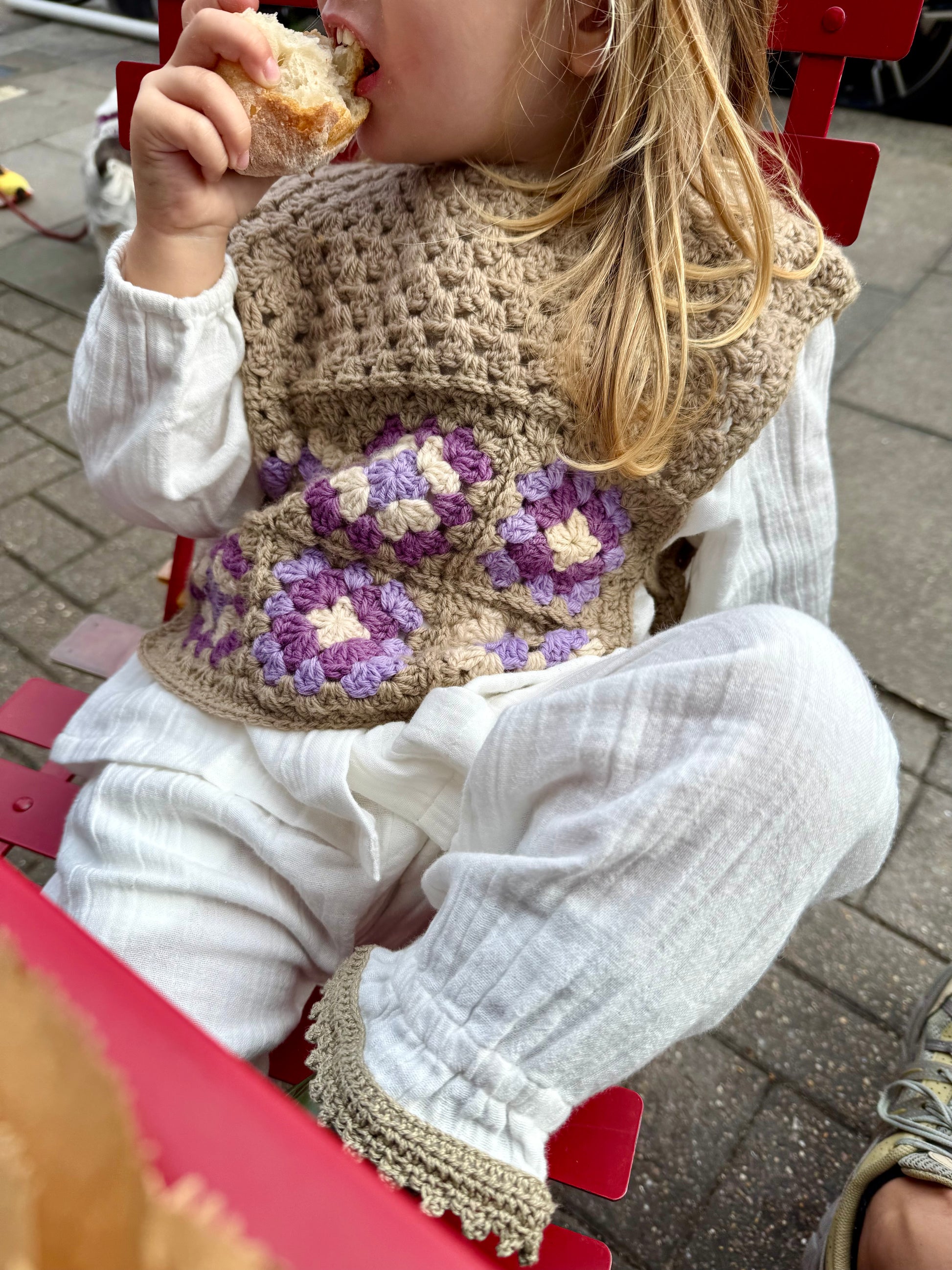 A playful tabard vest that ties twice on each side. Finished with two coconut buttons in the neck. This is a style that can easily be carried over from season to season.